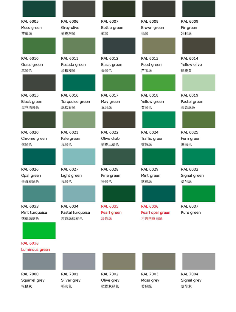 本公司標(biāo)準(zhǔn)顏色代碼與其它標(biāo)準(zhǔn)顏色代碼無直接聯(lián)系。如需其它標(biāo)準(zhǔn)顏色的對應(yīng)顏色,請咨詢本公司。如需常用顏色,請參見本公司的色卡。第五位數(shù)字可用于表示具有相同顏色,但由于各種原因(例如為了符合標(biāo) 準(zhǔn)或(當(dāng)?shù)兀┓梢螅┒捎貌煌伭系奶貏e配方。數(shù)字0、1、2、3 和4表示一種標(biāo)準(zhǔn)的無鉛配方,數(shù)字5、6、7、8和9表示使用含鉛顏料的產(chǎn)品。字母“Z”表示使用符合ASTM D520中第II 類鋅粉的鋅底漆。